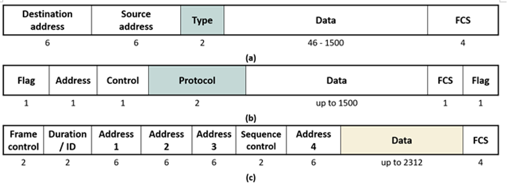 - 위의 그림은 각각의 데이터링크 기술의 헤더에서 IP데이터그램이 실려있음을 표시하는 부분을 나타낸다.