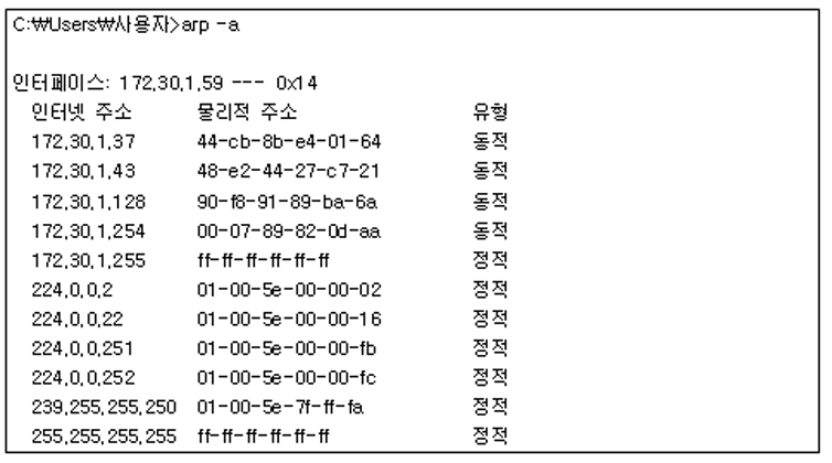 - 동적 : ARP 프로토콜에 의해서 동적으로 만들어지는 엔트리로, 다른 호스트와의 통신을 통해 알아온 정보이다. 일정시간만 유지된다.