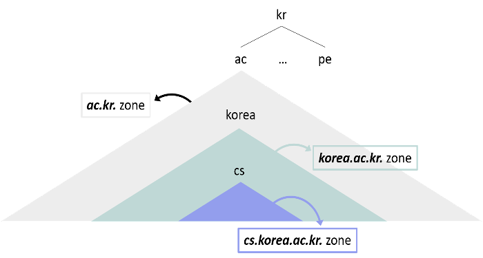 밑의 모든 정보들을 한 묶음으로 zone 파일에 관리 - KRNIC - kr 밑으로 오는 ac을 비롯한 다양한 도메인들의 zone file들을 연결 및 관리