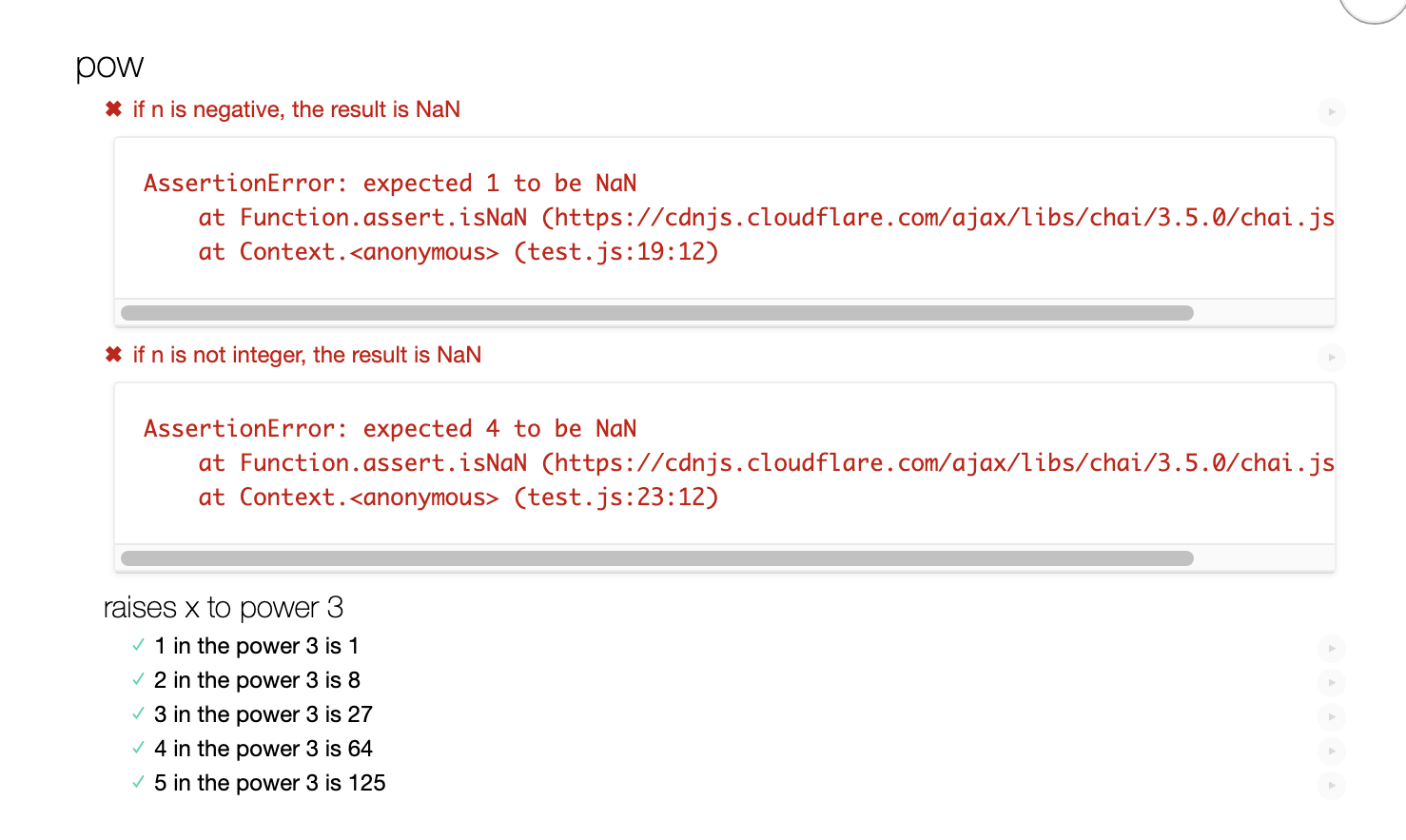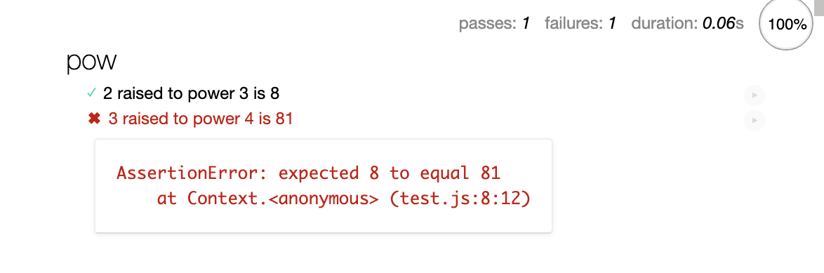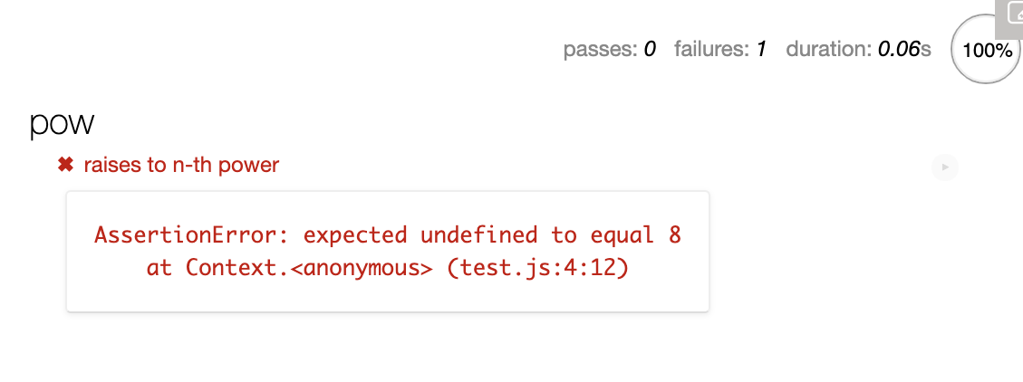 지금은 함수 pow 본문에 아무런 코드도 넣지 않았으므로 테스트가 실패할 수 밖에 없다. 실행해보면 결과는 다음과 같다. pow(2, 3)가 8이 아닌 undefined를 반환하기 때문에 에러가 발생하는 것이다.
