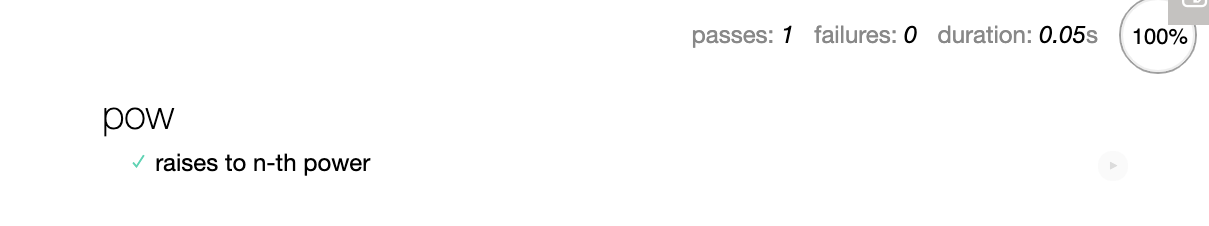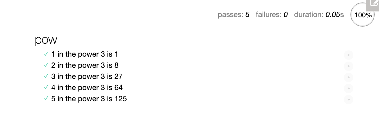 describe("pow", function() { it("2를 세번 곱하면 8이다.", function() { assert.equal(pow(2, 3), 8); }); it("3을 네번 곱하면 81이다.", function() { assert.equal(pow(3, 4), 81); }); });
