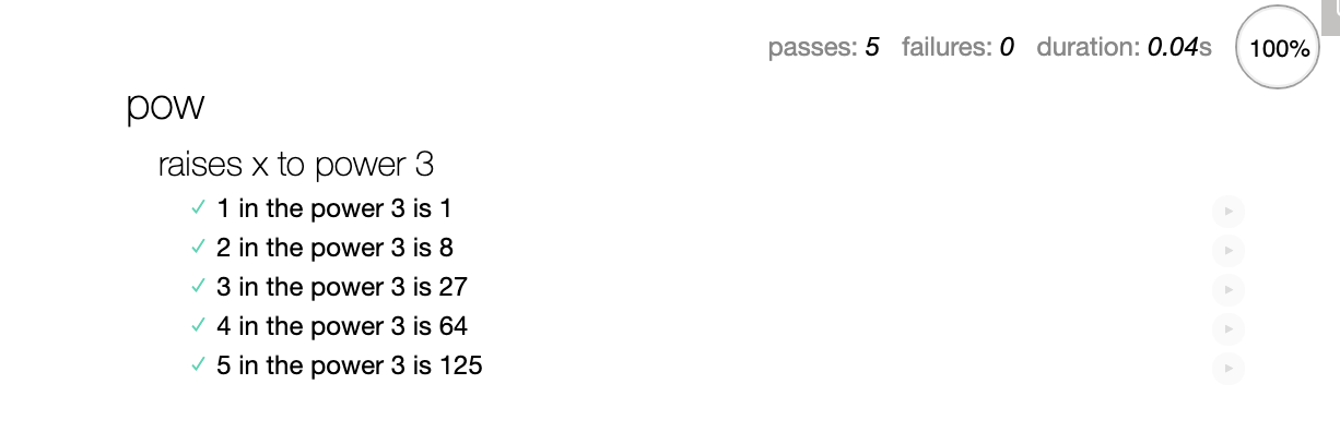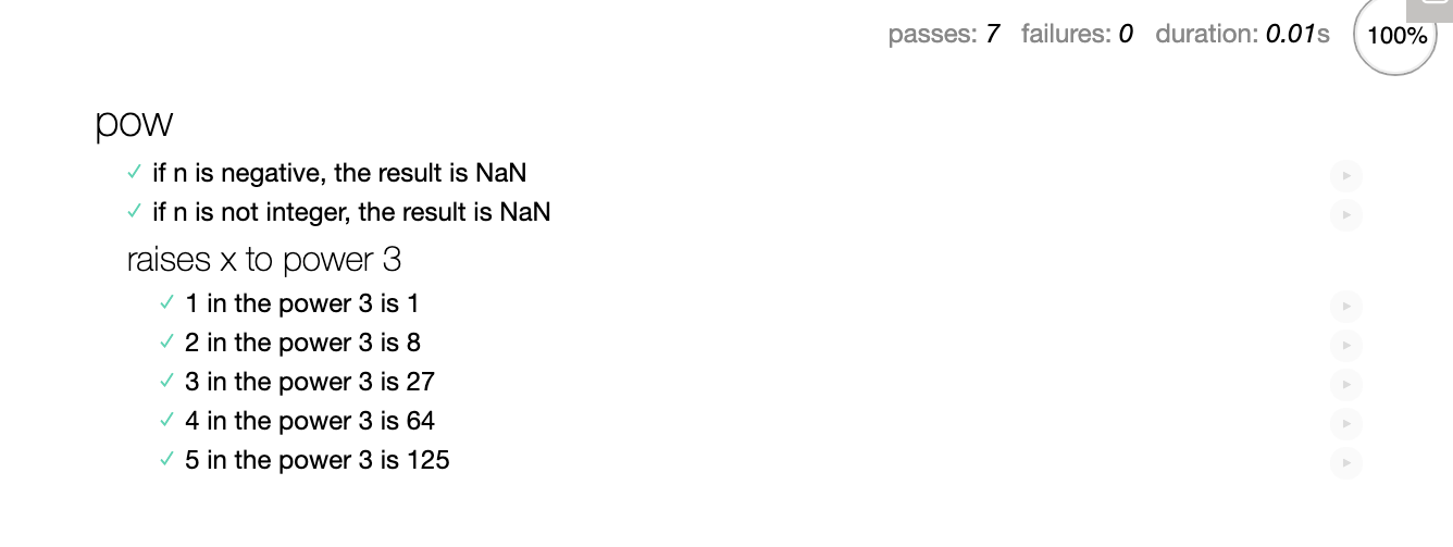 테스트를 몇 개 더 추가해볼 것이다. 아래 예시에서 헬퍼 함수 makeTest와 for문이 중첩 describe 안에 함께 묶여있다는 것을 눈여겨보자. makeTest는 오직 for문 안에서만 사용되고, 다른 데선 사용되지 않기 때문에 이렇게 묶어놓았다. 아래 스펙에선 makeTest와 for문은 함께 어우러져 pow가 제대로 동작하는지 확인해준다.