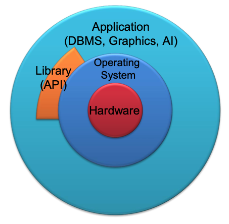하드웨어를 운영체제가 감싸고 있고, 여러 라이브러리가 존재하는데 이 중 System call을 통해서 어플리케이션이 커널로 들어오는 구조를 취한다. 예를 들어, 카카오톡 어플리케이션 메시지를 전송하기 위해 함수 호출(라이브러리, System call)을 통해 커널을 요청한다. 그러면 커널이 그에 응답하여 패킷을 만들고 하드웨어를 전달한다. 메시지는 하드웨어를 통해서 바깥으로 나가고, 인터넷을 거쳐 다른 기기에 도착하는 것이다. 어플리케이션은 절대 하드웨어를 제어할 수 없고, 언제까지나 운영체제를 통해서만 가능하다. 또한 어플리케이션은 함수 호출 없이 운영체제에 요청할 수도 없다. 정형화된 라이브러리들은 편리하지만, 정의된 것 이상의 복잡한 제어를 하기는 힘들기 때문에 커널에 직접 접근이 가능한 조치를 취해줘야 한다.