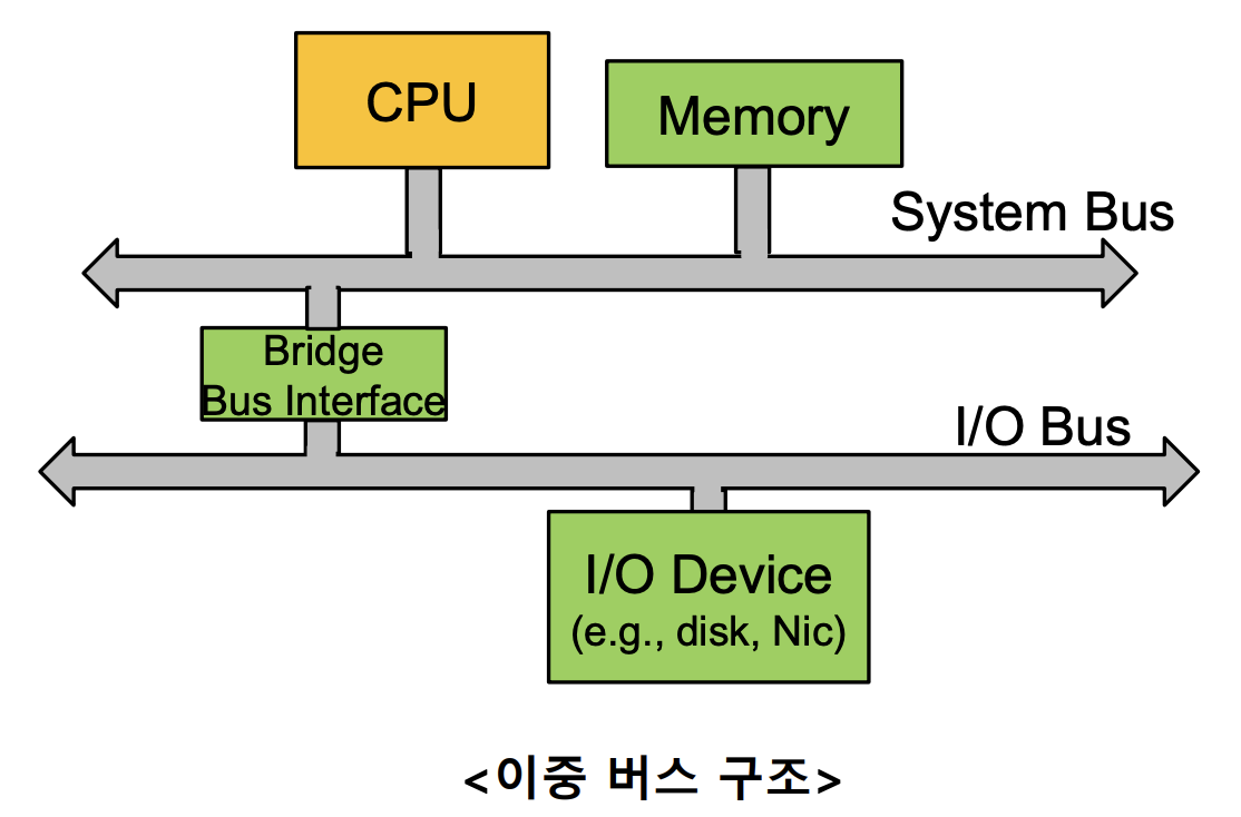 - 버스를 둘로 분리함으로써 CPU와 Memory가 I/O 디바이스를 기다리는 일을 방지한다.