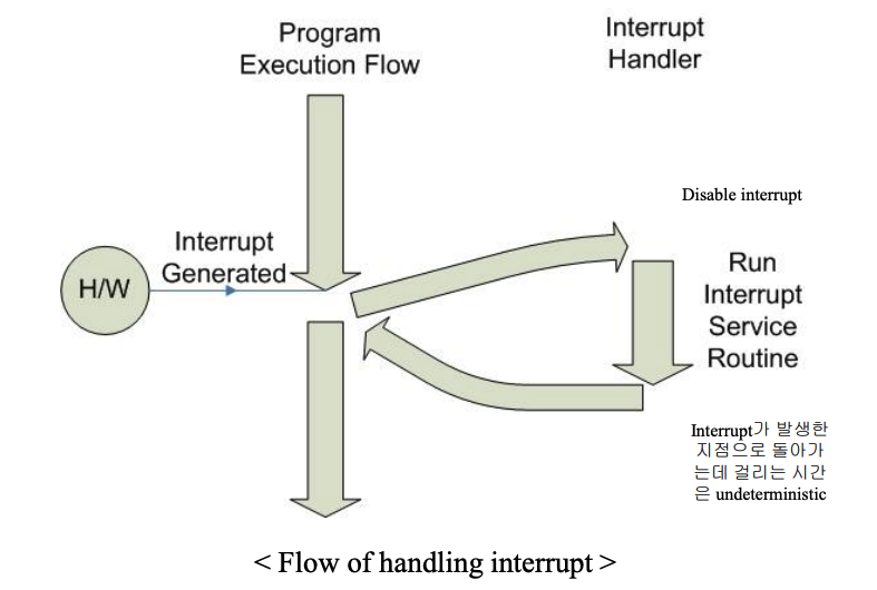- 만약 현재 ISR 중에 있는 인터럽트보다 더 우선순위가 높은 인터럽트가 발생하면 이를 바로 처리해줘야하므로, ISR이 완료되고 Interrupt가 발생한 지점으로 돌아가는 데 걸리는 시간(위의 처리 순서에서 2, 3 번에 해당하는 과정)은 undeterministic인 것이다.
