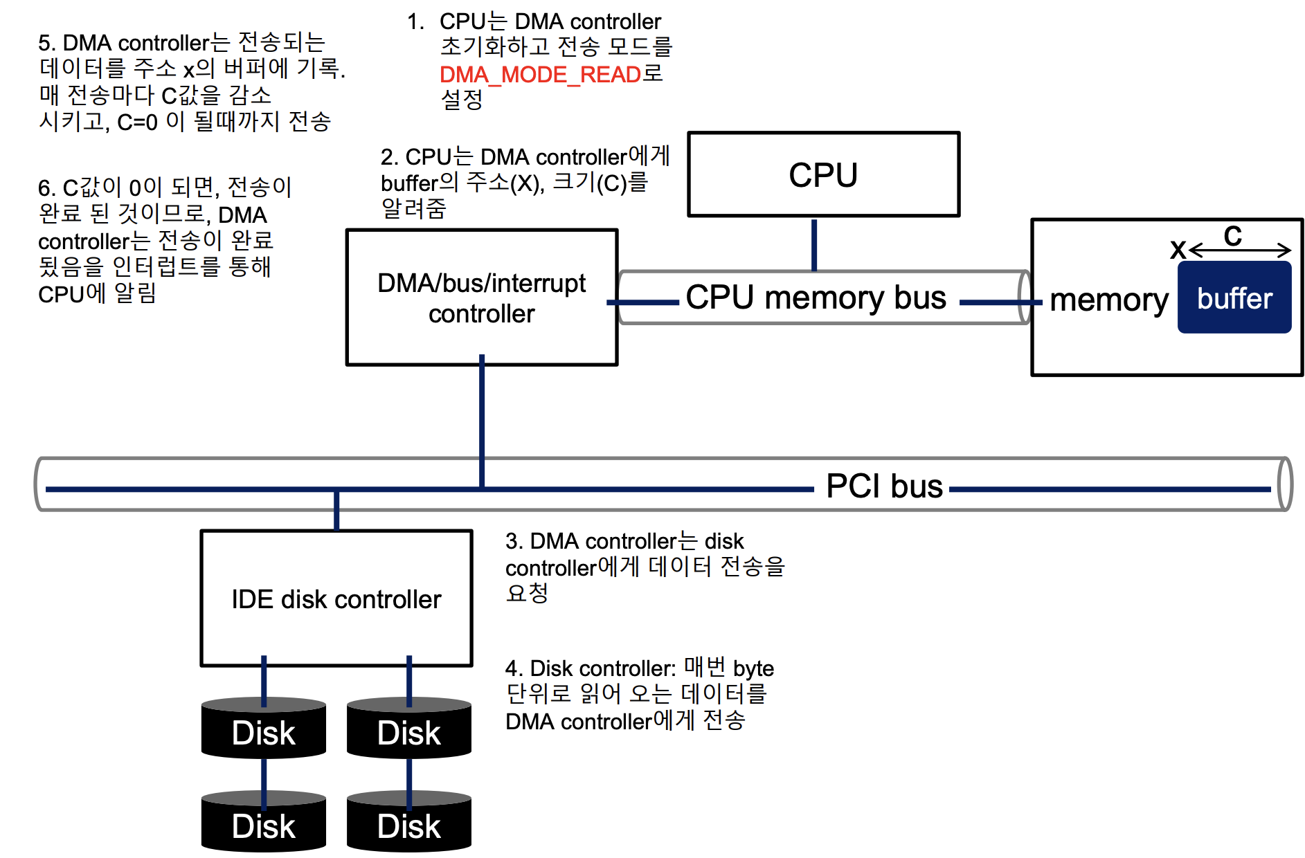 - C 값이 0이되면, 전송이 완료된 것이므로, DMA Controller는 전송이 완료됐음을 인터럽트를 통해 CPU에 알림