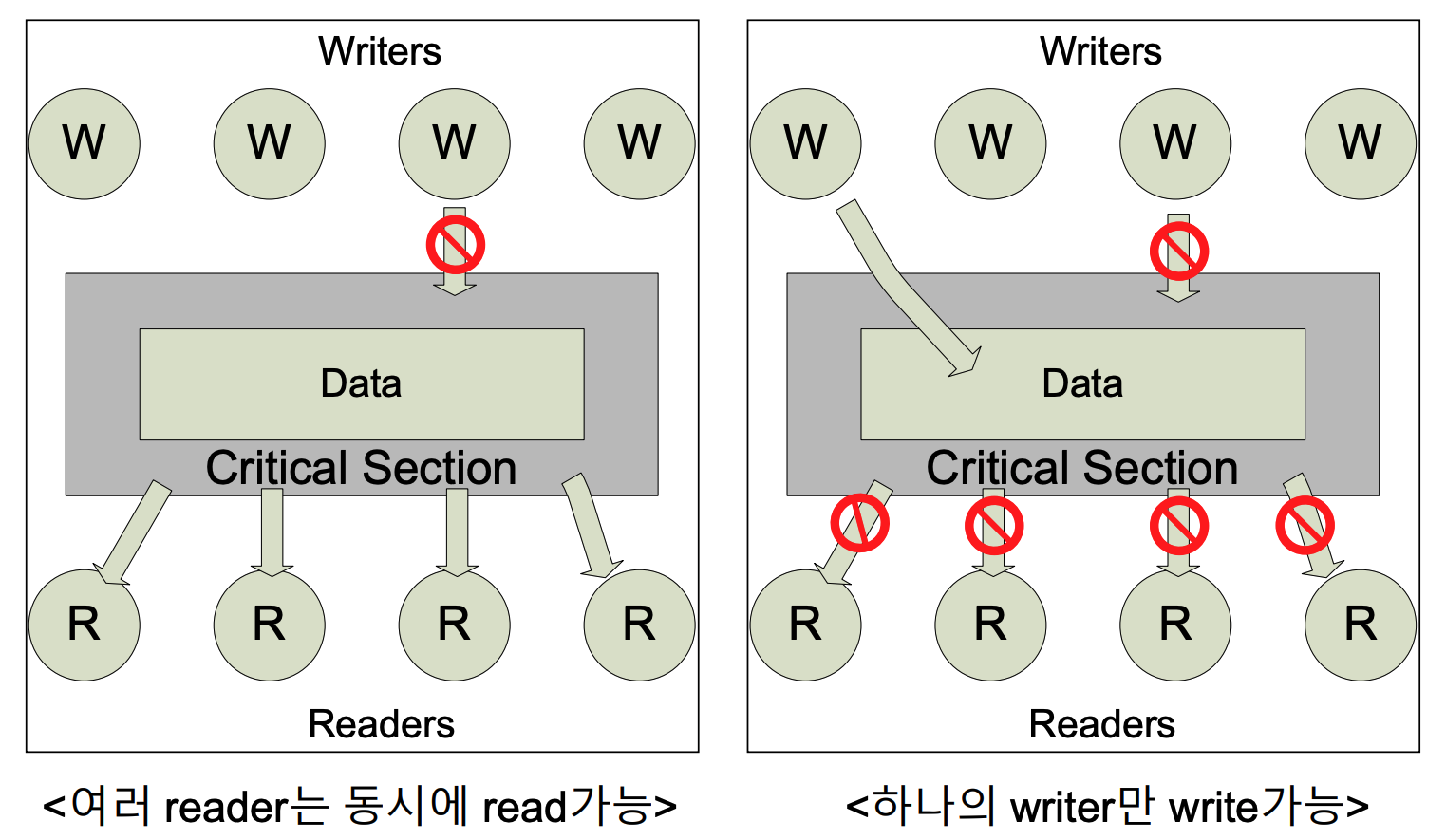 - 여러 Readers와 Writers가 하나의 공유 데이터를 읽거나 쓰기 위해 접근