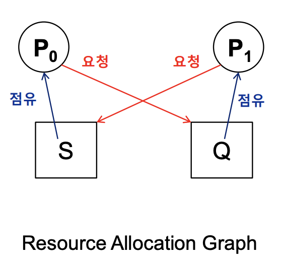 Q : P0가 wait(S)로 S를 점유하고 있고 P1이 wait(Q)로 Q를 점유하고 있다면 각각의 프로세스들은 critical section으로 들어가서 작업을 하고 V(s), V(Q)로 빠져나오지 않나요? 왜 Wait(S)를 하고 critical region에 들어가서 작업을 하고 V(S)를 바로 하지 않고 다시 wait(Q)를 하여 무한루프를 도는지 궁금합니다. 그리고 여기서 S와 Q를 점유한다는것이 critical region에 들어갔다고 이해해도 되는지와 S와 Q가 정확이 어떤것을 지칭하고 있는지 궁금합니다. A : 앞에서도 말했다시피, 질문에서처럼 같이 V 작업 처리를 안해주고, 바로 다른 자원을 요청하고 있는 프로그램이 충분히 있을 가능성이 있고, 이 특이한 상황에서는 커널이 Deadlock을 막을 수 없다. 이처럼 P나 V가 있어야할 곳에 없거나, 혹은 세마포 자체가 cross되는 상황에서는 Deadlock이 발생할 수 있다.