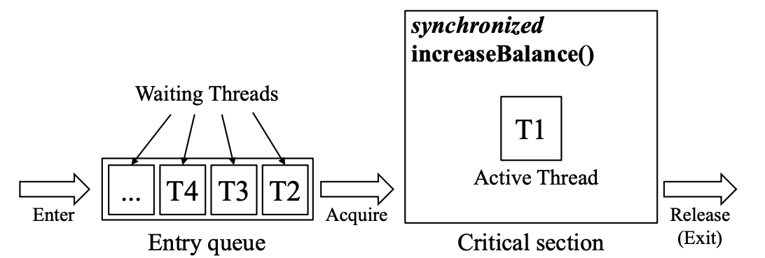 - 쓰레드 T1이 increaseBalance() 함수에서 나간 후에 다른 쓰레드가 함수에 진입할 수 있음