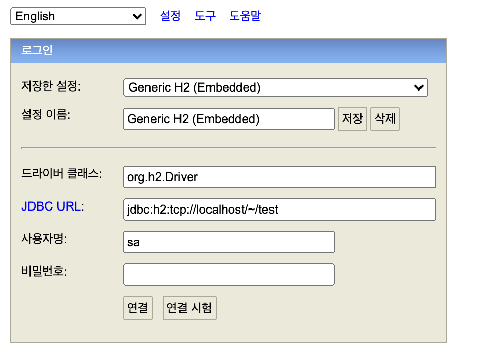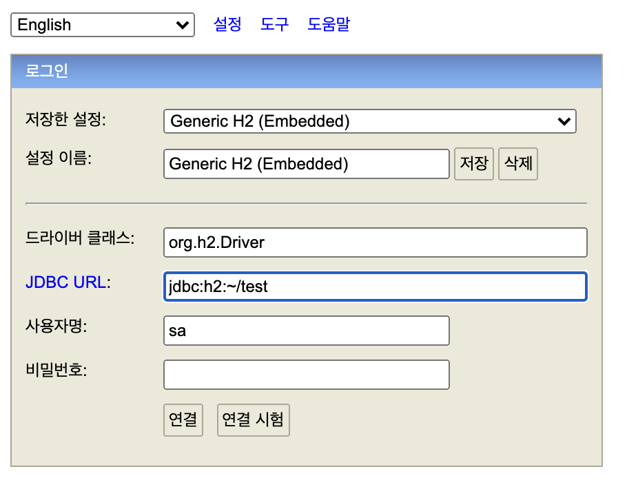 최초에는 이 데이터베이스 파일을 만들어야 한다. 지금 있는 jdbc url이 홈에 있는 test라는 파일의 경로를 말해준다. 이것을 그대로 바꾸지 않고 연결 버튼을 누르면 홈에서 test.mv.db 파일이 만들어진다.