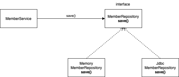위의 그림처럼 MemberService가 MemberRepository 구현체에 대하여 save()를 호출했다고 하자. 그렇다면 이 MemberRepository 인터페이스를 구현한 것이 MemoryMemberRepository냐, JdbcMemberRepsitory냐에 따라서 호출되는 메서드가 달라질 것이다. 이때, 클라이언트인 MemberService는 MemberRepository 인터페이스에 의존하고 있으며, 어떤 객체가MemberRepository 인터페이스를 구현하고 있다면 다형성에 의해서 이 인터페이스 변수에 할당이 가능하다. 따라서 이 변수에 MemoryMemberRepository와 JdbcMemberRepository 둘 중 무엇을 할당하든 클라이언트는 정상적으로 그 안에 오버라이딩된 save()를 호출할 수 있다.